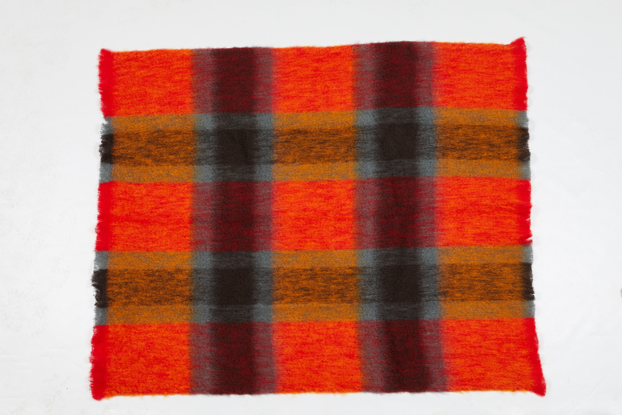 Mohair plaid blanket with a combination of reds with grays and oranges, which creates a warm and cozy atmosphere in any home.