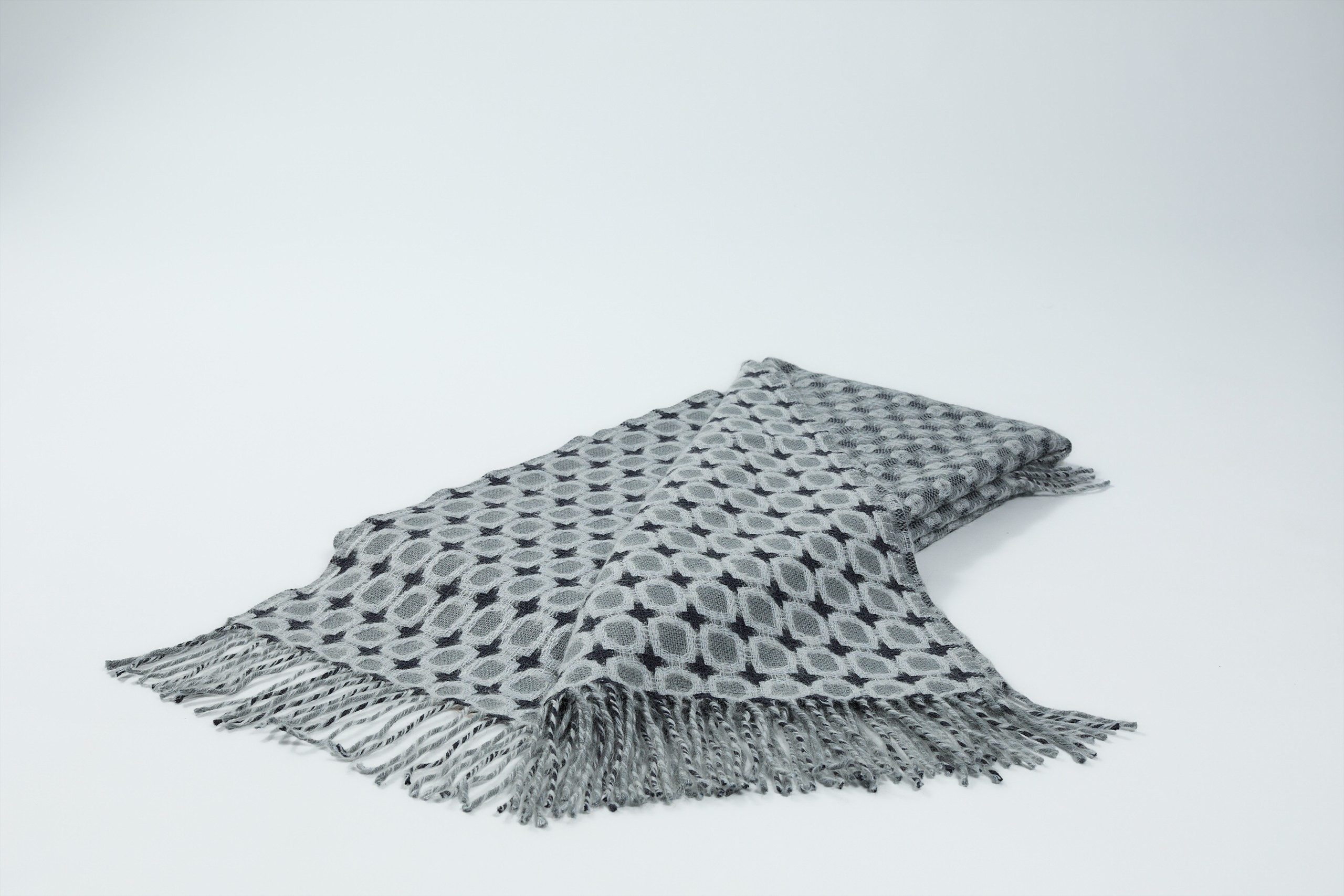 Picasso blanket with the base of the blanket in gray and maroon and the mohair circles in gray.