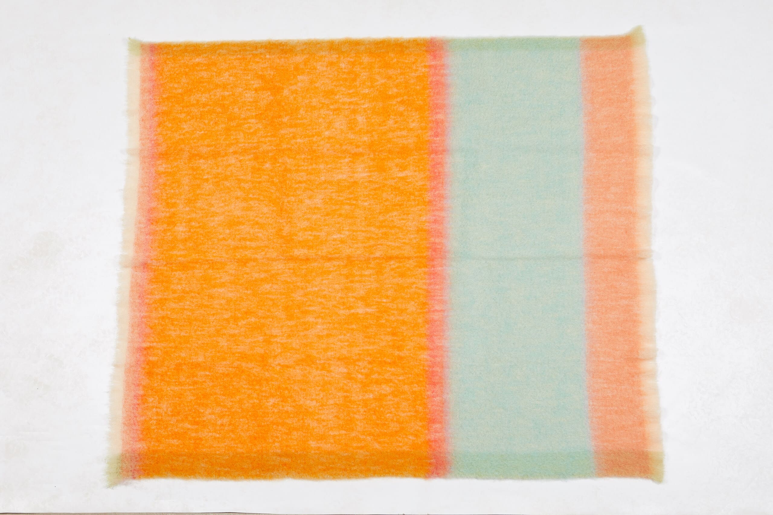 This handmade blanket is a true masterpiece that combines peachy orange with light pastel blue and different shades of pink, creating a unique and elegant design.